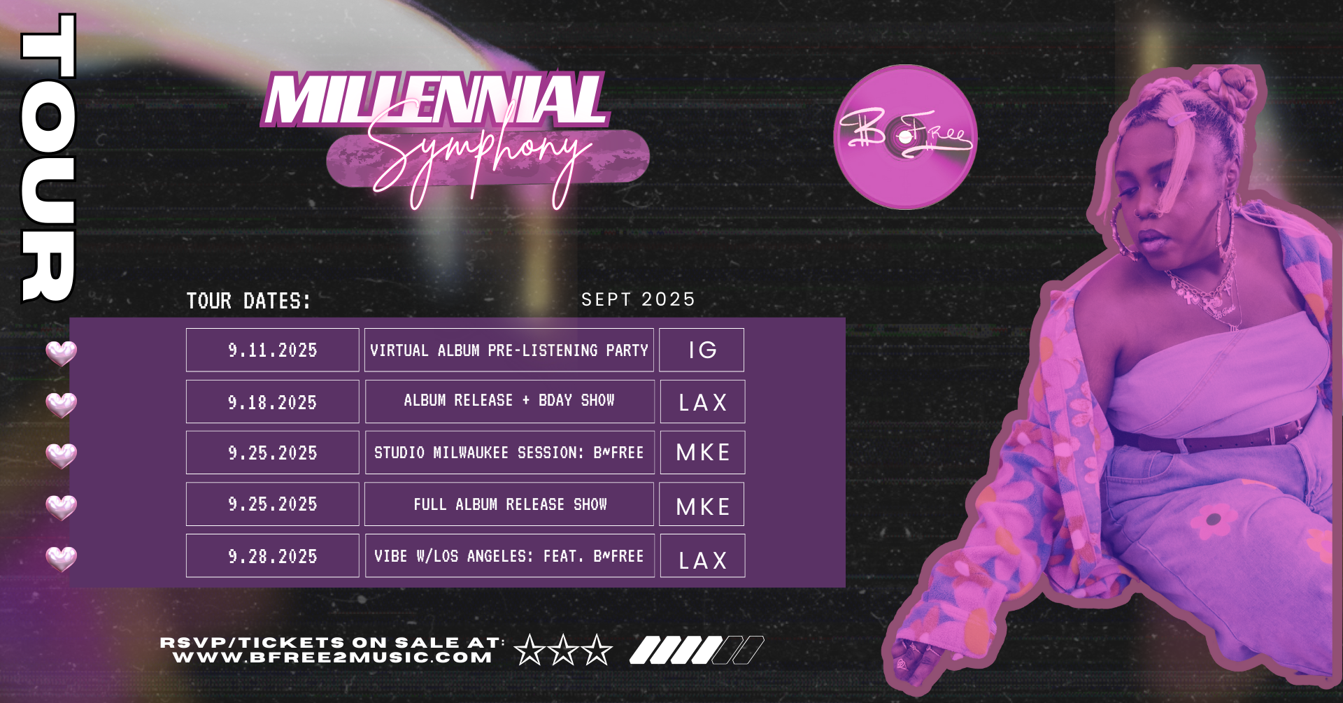 B~Free’s highly anticipated third album, ‘Millennial Symphony,’ arrives on September 18 (her birthday!), blending R&B, hip hop, house & symphonic vibes into the ultimate millennial soundtrack. To mark the moment, she’s embarking on her first-ever tour: a free virtual listening party on Sept 11, the official album release & birthday show in Los Angeles on Sept 18, and a one-night-only, all ages release show in Milwaukee on Sept 25, where she’ll perform the full album front-to-back with special guests Brit Nicole, Genesis Renji, Jovan Landry, Lili K & Klassik. The month wraps with Vibes w/ LA on Sept 28, featuring BFree & Friends, an open jam session, & DJ Soosh. 🎶✨